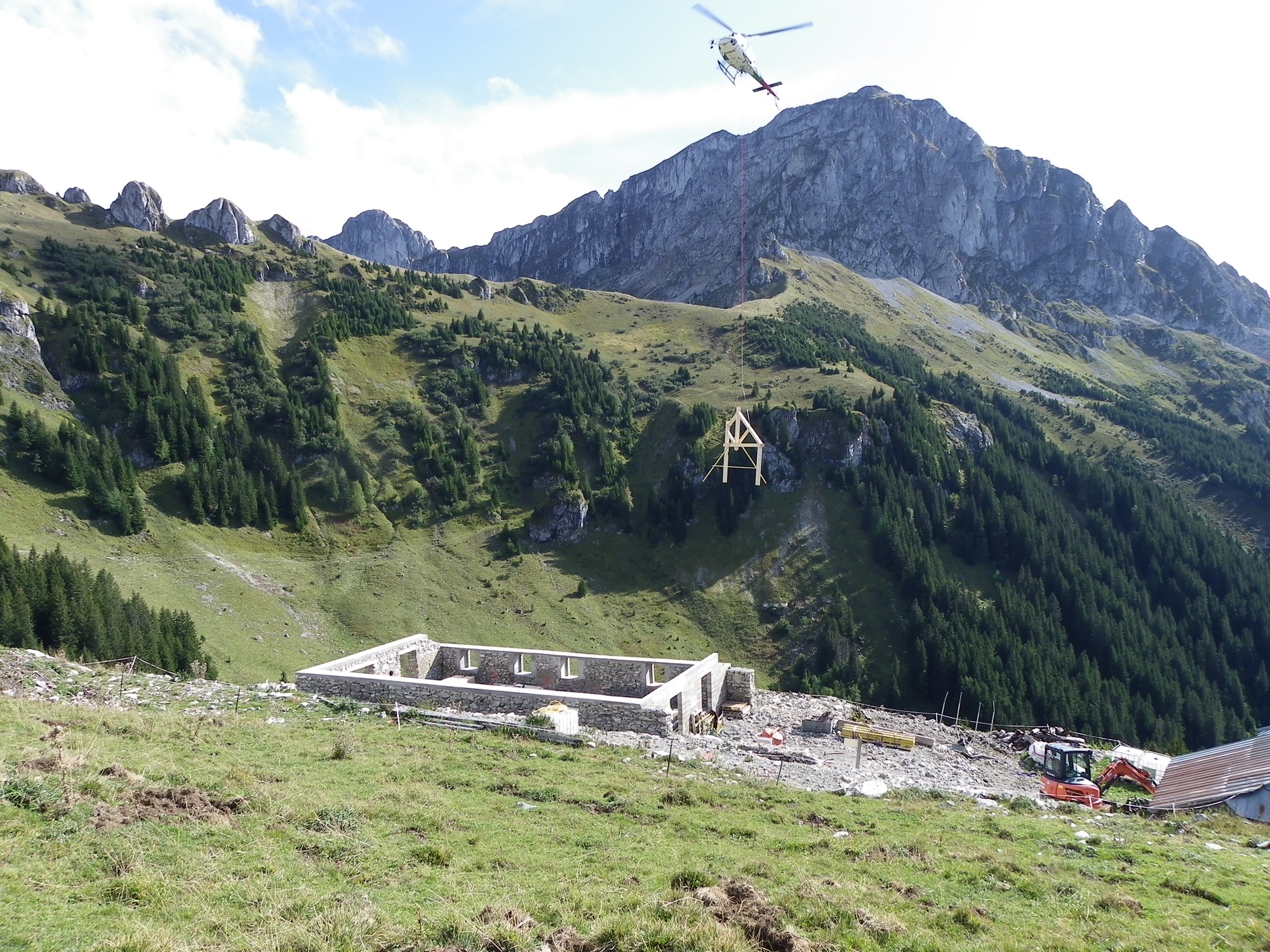Ainsi, nous acheminons les pièces de bois et matériaux par hélicoptères pour pouvoir travailler en refuges ou dans des lieux où l’accès en camion est impossible.